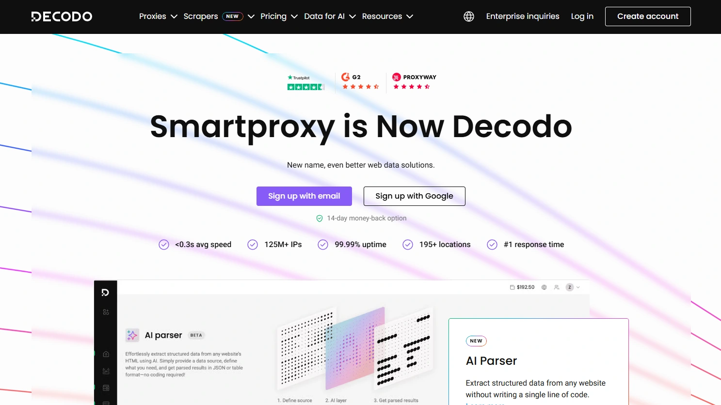 | Decodo | Per-GB tiers and per-IP monthly plans | HTTP(S), SOCKS5 | 99.99% uptime; shared and dedicated DC proxies |
