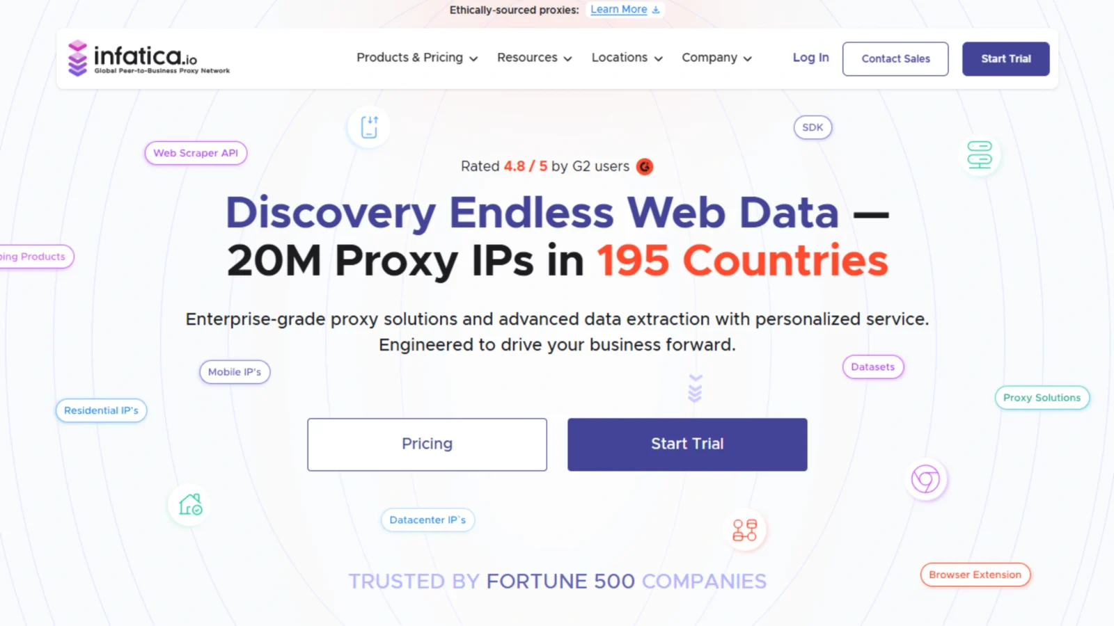 | Infatica | Per-IP; dedicated static | HTTP(S), SOCKS5 | ~200k servers in many countries; no traffic limits on dedicated |