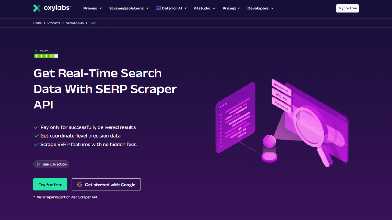 Oxylabs is another top-tier provider known for its enterprise-level solutions and premium proxy pool. Their SERP Scraper API is an AI-powered tool designed to deliver structured, ready-to-use data.
