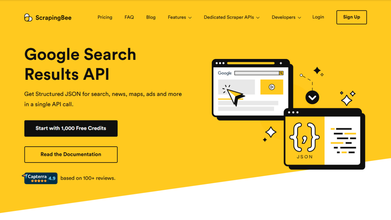 | ScrapingBee | Excellent for JavaScript-heavy sites; uses a real Chrome browser for rendering. | Subscription | 1,000 free API calls | JSON, HTML |