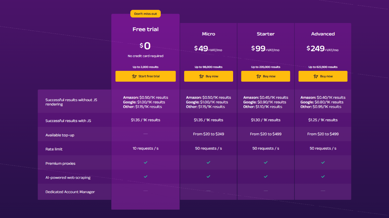 Pricing is tiered based on the number of results (pages scraped) you need per month and whether you require JavaScript rendering (which costs slightly more).