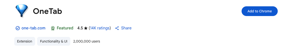| OneTab | Tab list conversion, Memory saving, Easy sharing | Free | Reducing browser clutter and memory usage |
