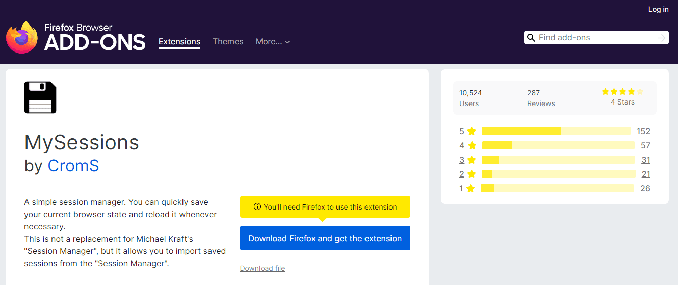 MySessions is a simple and straightforward session manager for Firefox. Its core philosophy is to save your Browse sessions reliably and without fuss.