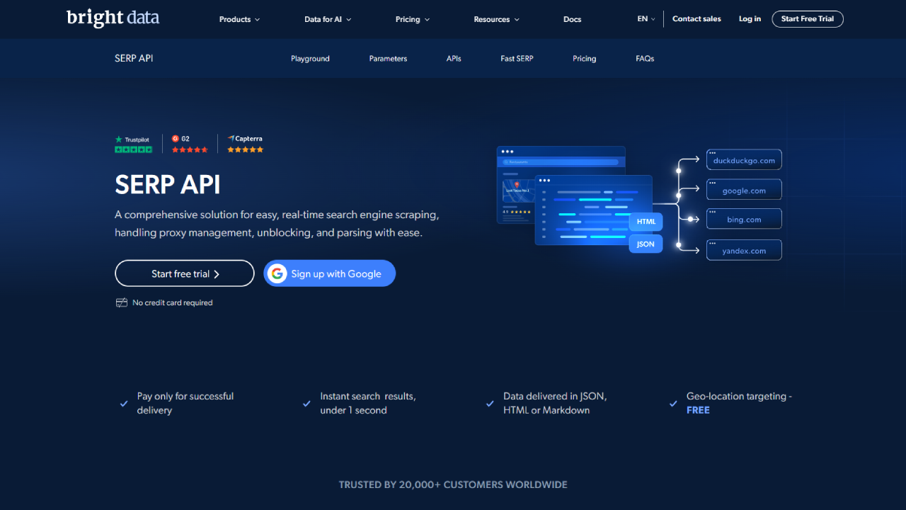 Bright Data is a giant in the web data space, providing a SERP API backed by its massive and ethically-sourced proxy network of over 72 million IPs.