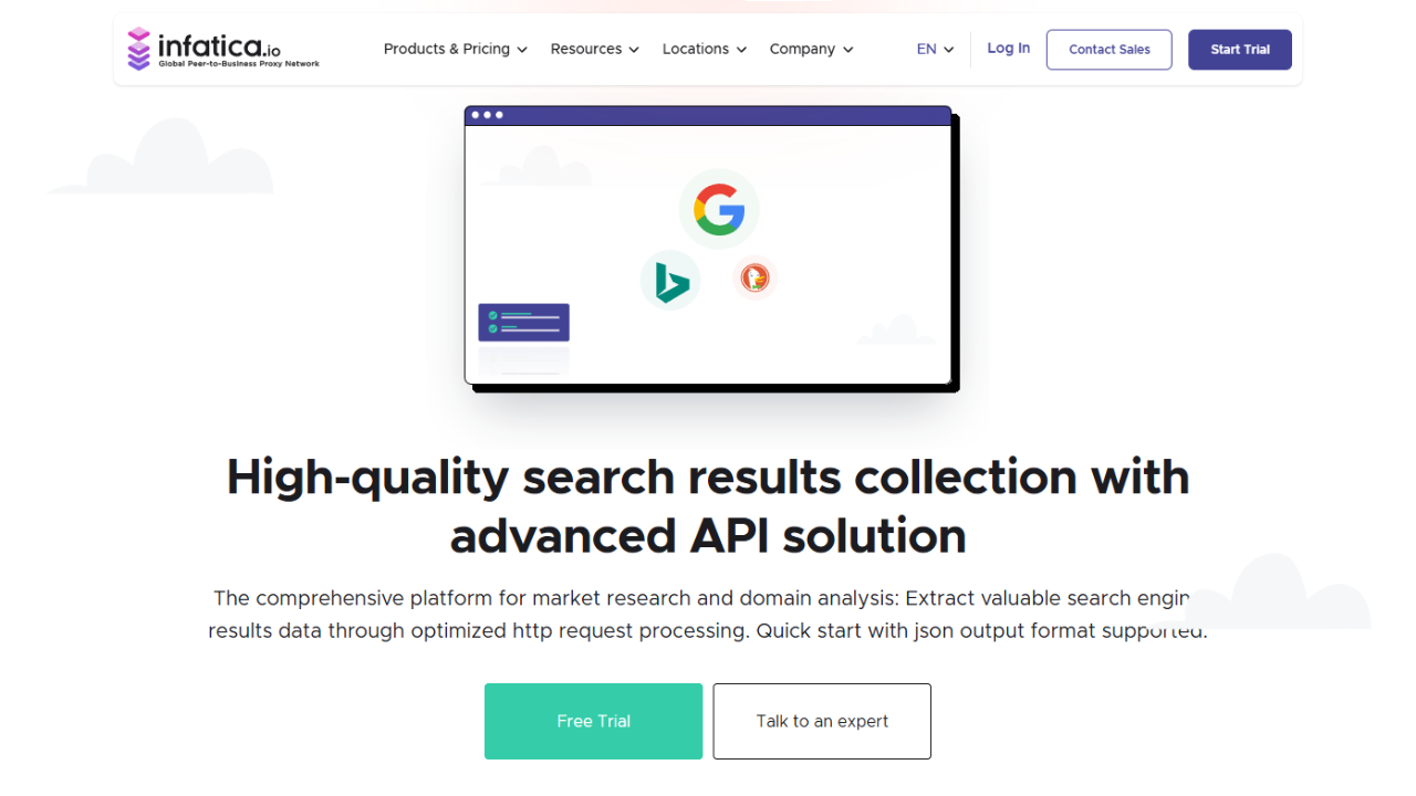 Infatica is different from the others on this list. It is primarily a proxy service provider, not an all-in-one SERP API. It offers a massive pool of residential, mobile, and datacenter IPs that you can use to build your own SERP scraper.
