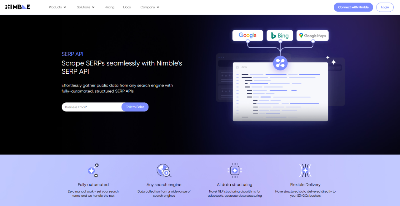 Nimble (formerly NimbleWay) provides a comprehensive web data collection infrastructure. Their SERP API is a core part of their service, designed for stability and scale.