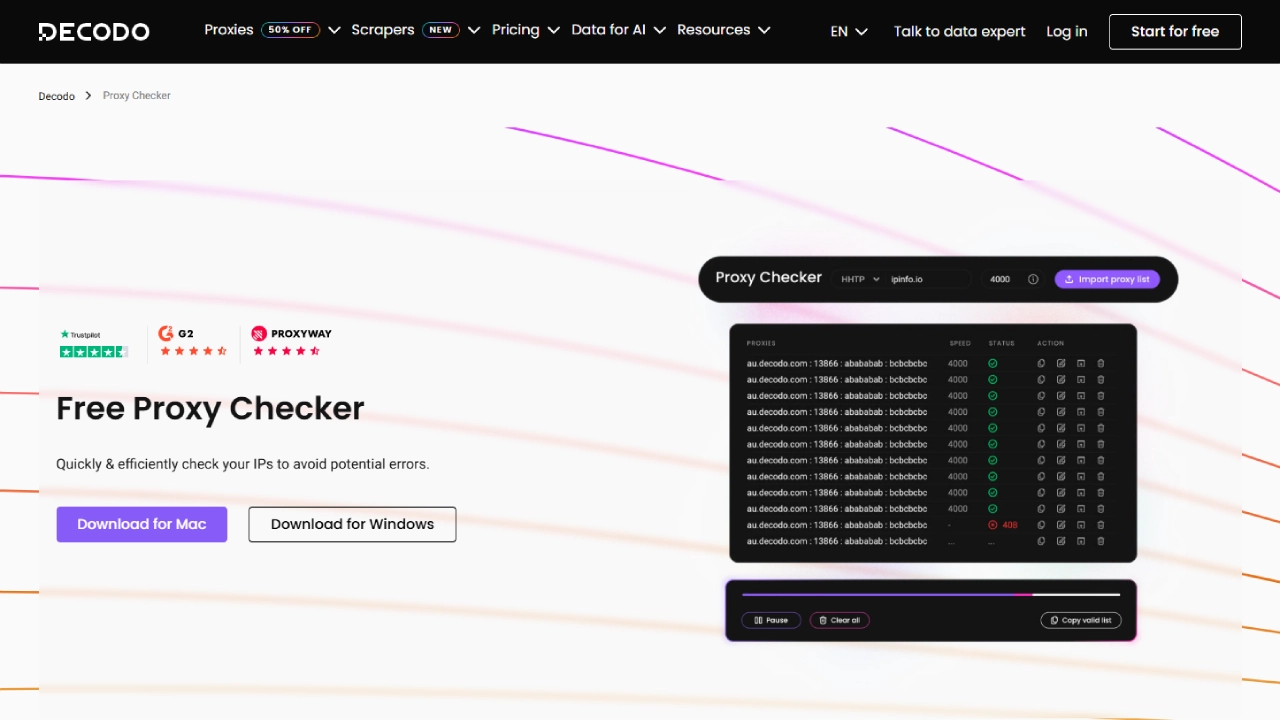 Decodo's Proxy Checker is a powerful desktop application for both Windows and Mac. Because it's a dedicated app, it can handle serious workloads, including lists of up to 10,000 proxies at a time.