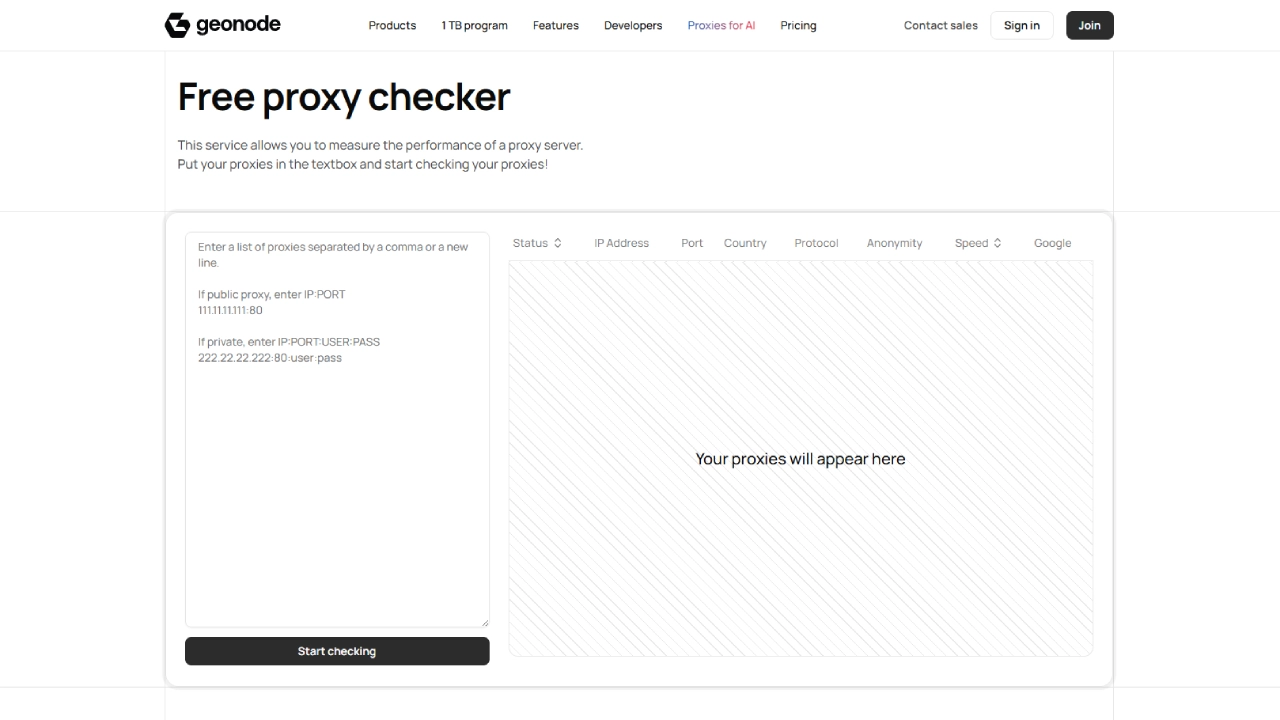 ProxyGraphy offers a clean and straightforward free proxy tester. You can paste your list in the standard HOST:PORT:USER:PASS format, and it quickly gets to work.