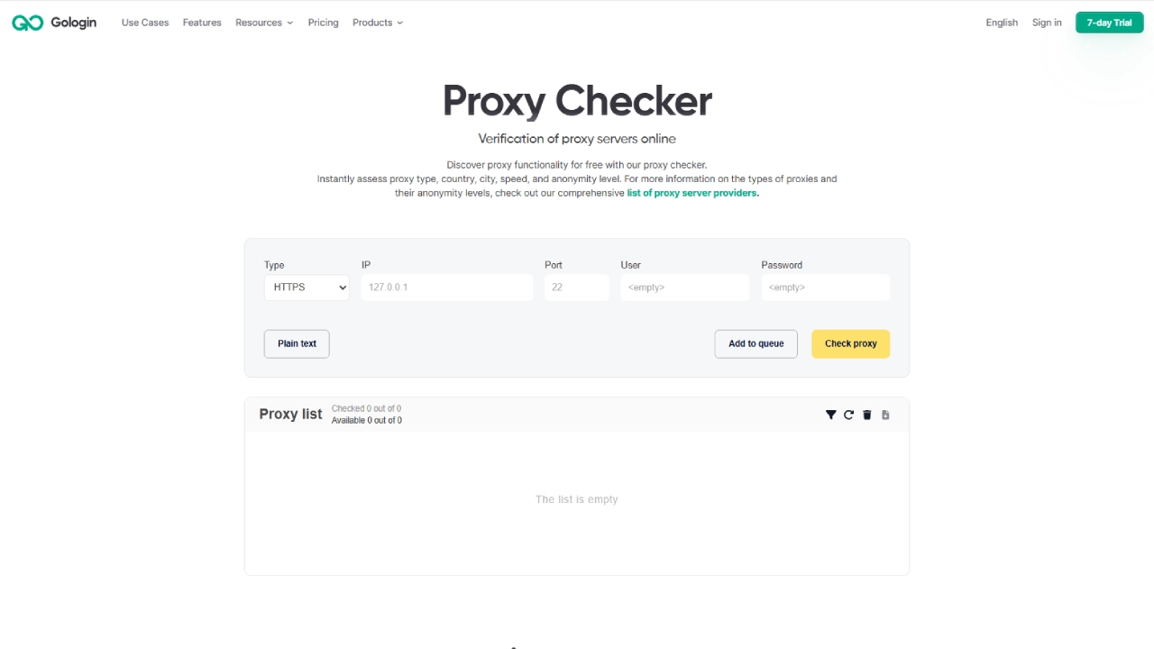 GoLogin's proxy checker is built for speed. It can process a large number of proxies very quickly, making it ideal for users with long lists. The tool checks HTTP, HTTPS, SOCKS4, and SOCKS5 proxies.