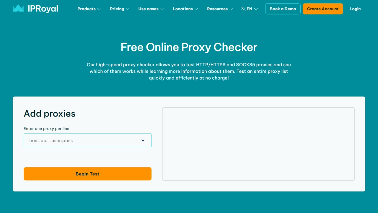 The online proxy checker from IPRoyal is designed for efficiency. It supports both HTTP/S and SOCKS5 proxies. What sets it apart is the "Status Code" column in its results.