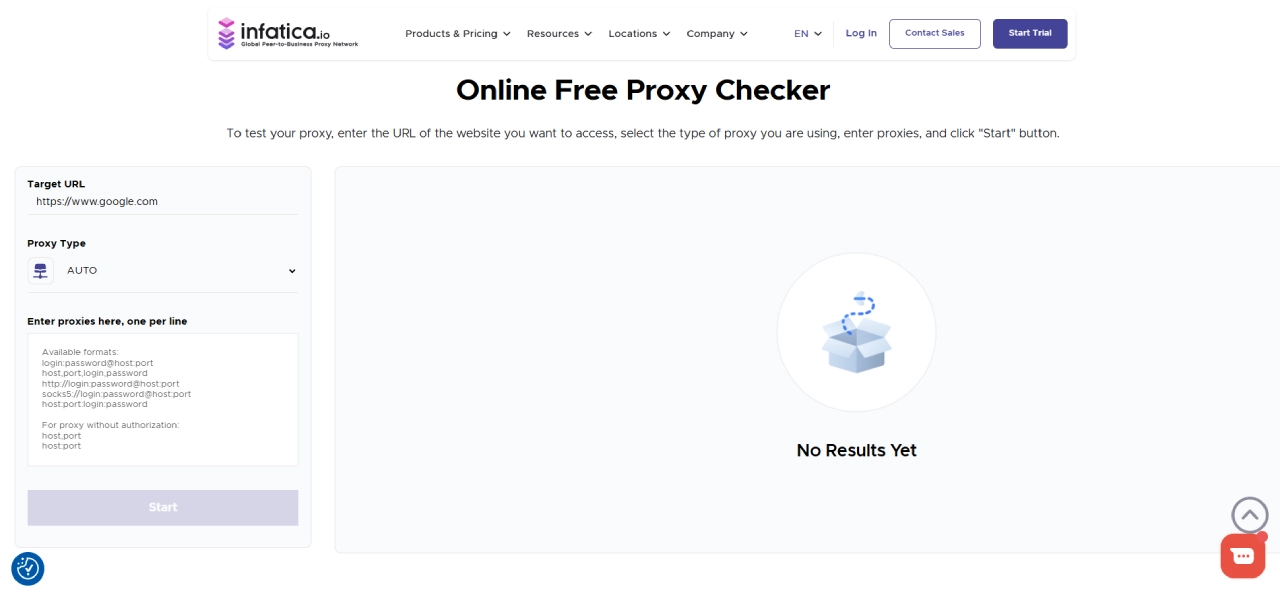 Infatica's proxy checker is a robust tool that supports a wide array of protocols, including HTTP, HTTPS, SOCKS4, and SOCKS5. When you run a test, it provides a comprehensive report for each IP.