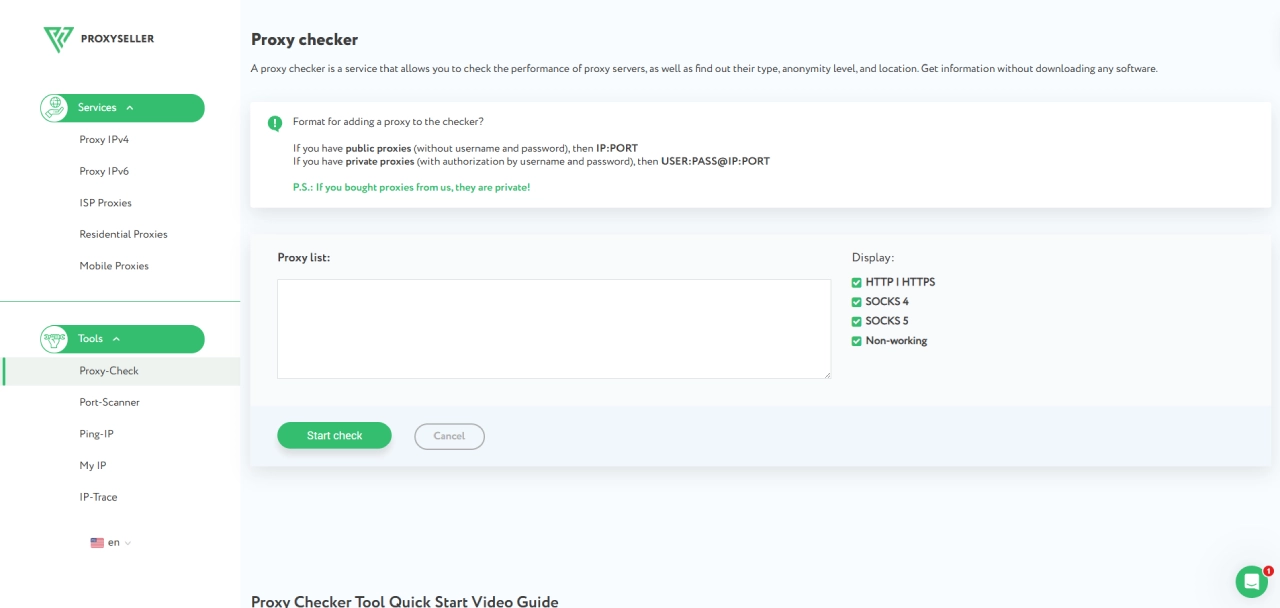 Proxy-Seller provides a free proxy checker that is both fast and comprehensive. It can handle HTTP, HTTPS, SOCKS4, and SOCKS5 proxies and allows you to check up to 100 proxies at one time.