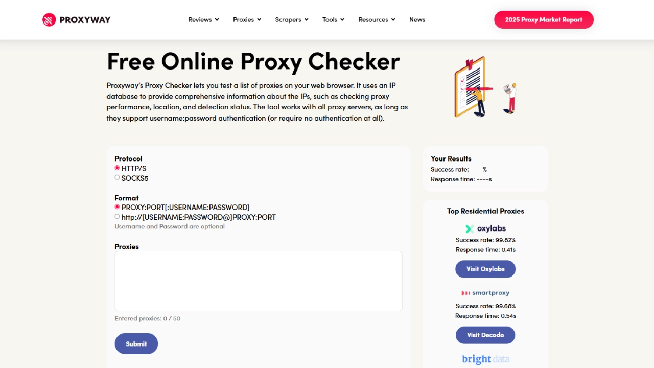 Proxyway's free online checker is a fantastic all-in-one tool. You can check up to 50 proxies at once, supporting both HTTP/S and SOCKS5.
