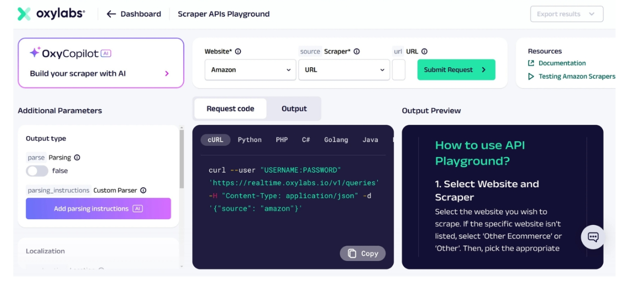 OxyCopilot is an AI-powered assistant integrated into the Oxylabs dashboard. It allows you to use plain English prompts to describe the data you want to scrape (e.g., "get all product names and prices from this page"). The AI then automatically generates the necessary scraping code and parsing instructions, which significantly speeds up development time.