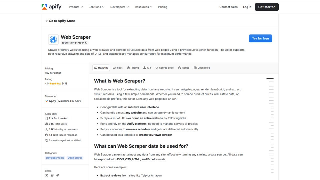 | Apify | A full platform with 1,600+ pre-built scrapers ("Actors"). | Yes | Free plan available. | Developers and non-coders who want a flexible platform with pre-built tools. |